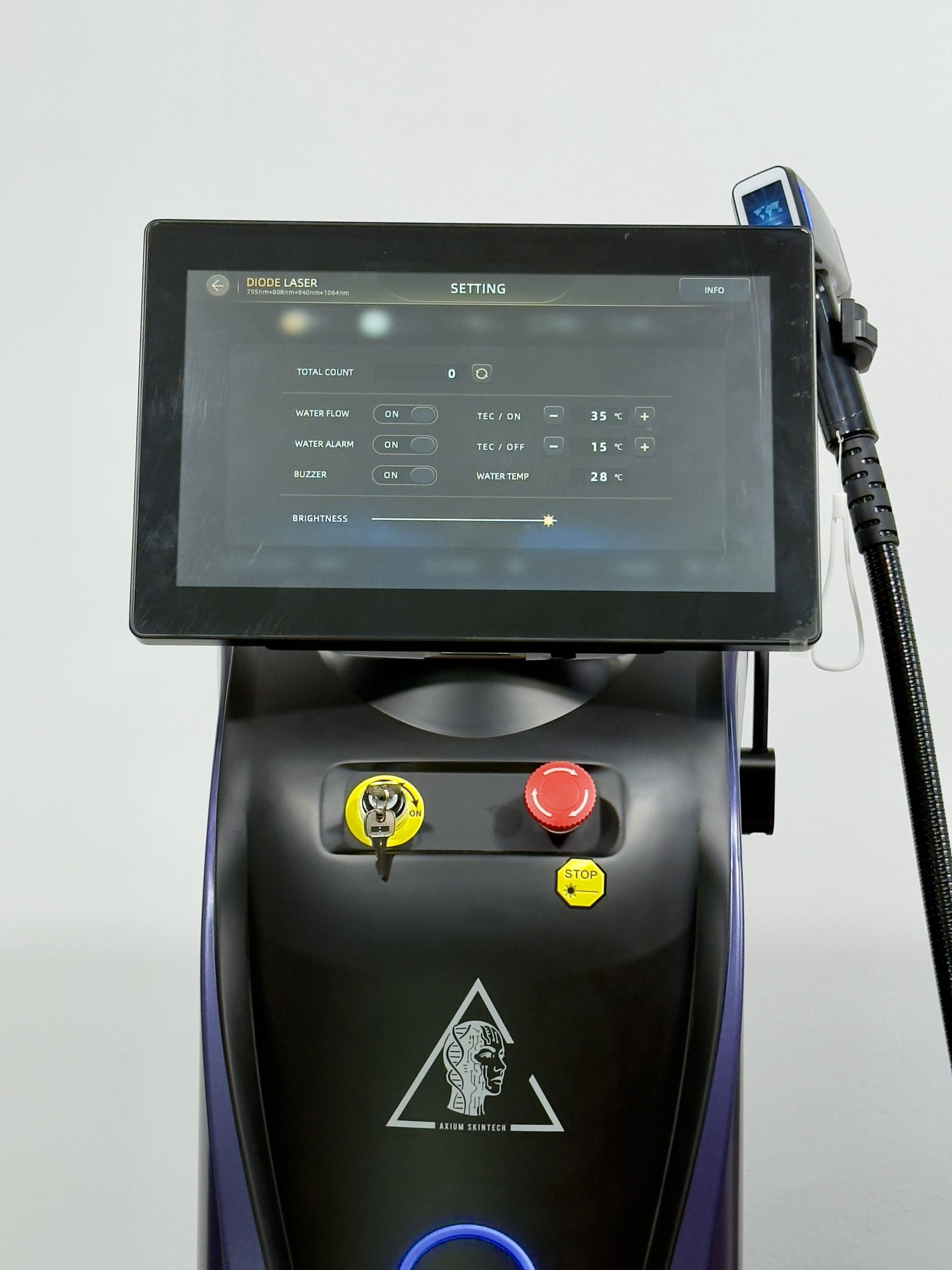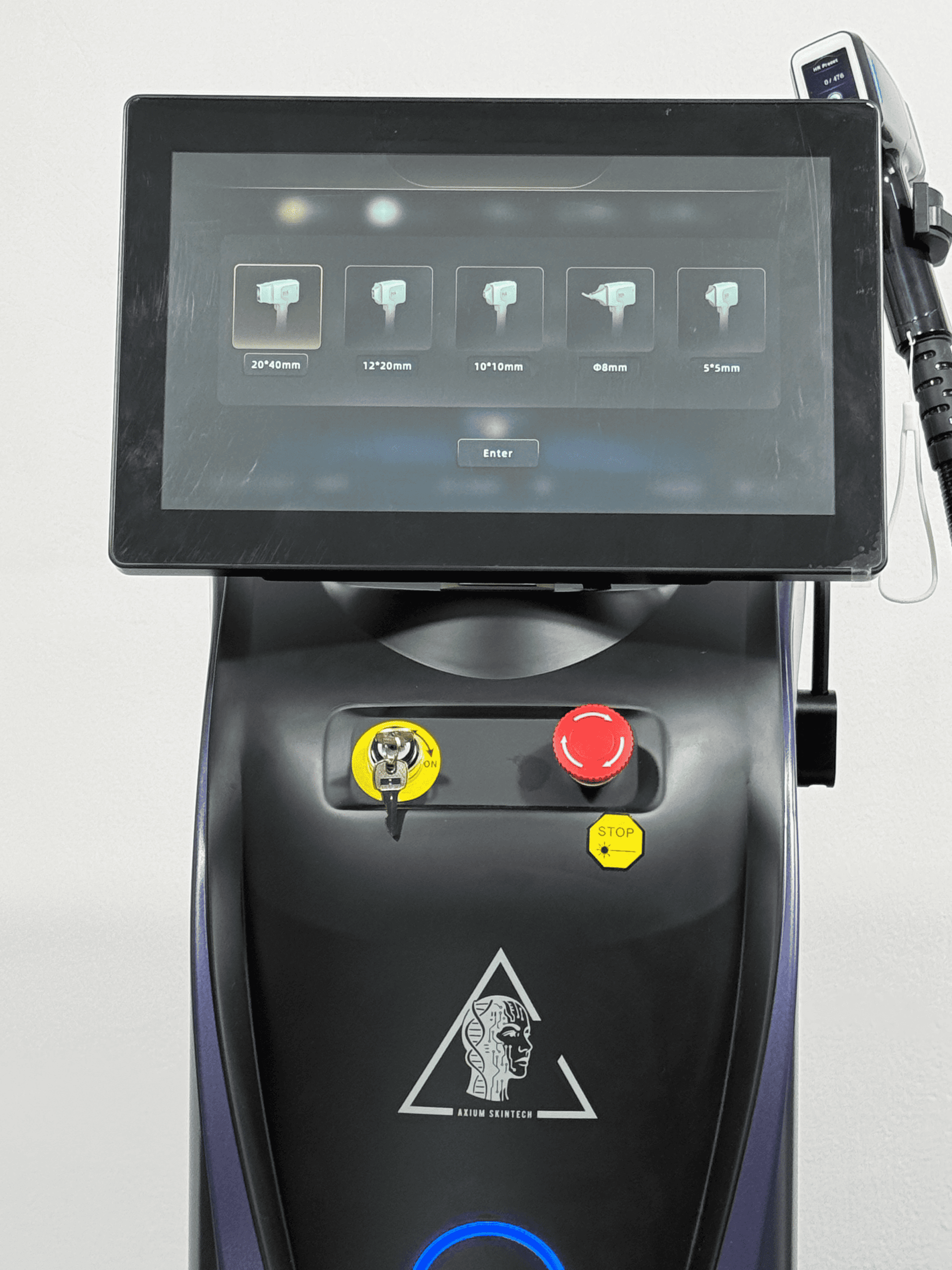 Manipulul laserului Axium Skintech integrează cea mai nouă tehnologie de răcire triplă – apă, aer și TEC (semiconductor), cu transfer direct prin vârful de safir medical.